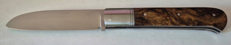 2 pièces lame inox N690Co brillante, ressort et mitres en Z40, platines en Z8 et manche en loupe de noyer
